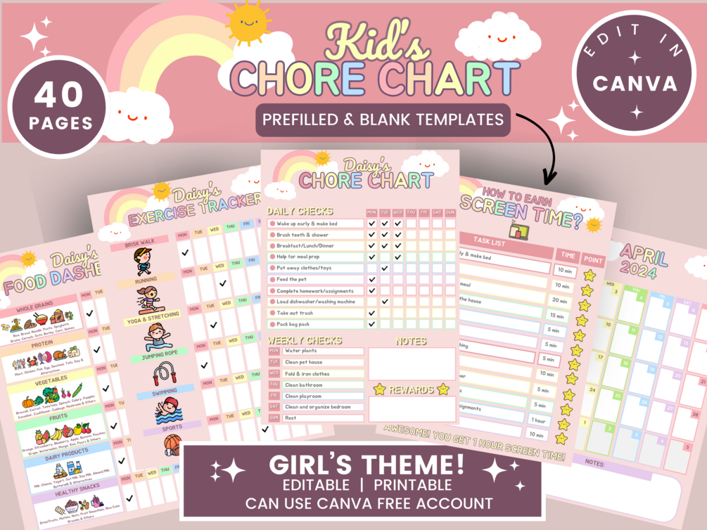 Editable Canva Chore Chart | Chore List | Summer Bucket List | Kids Routine | Consequence Chart | Reading Log | Food Log | Screen Time | Girl Planner