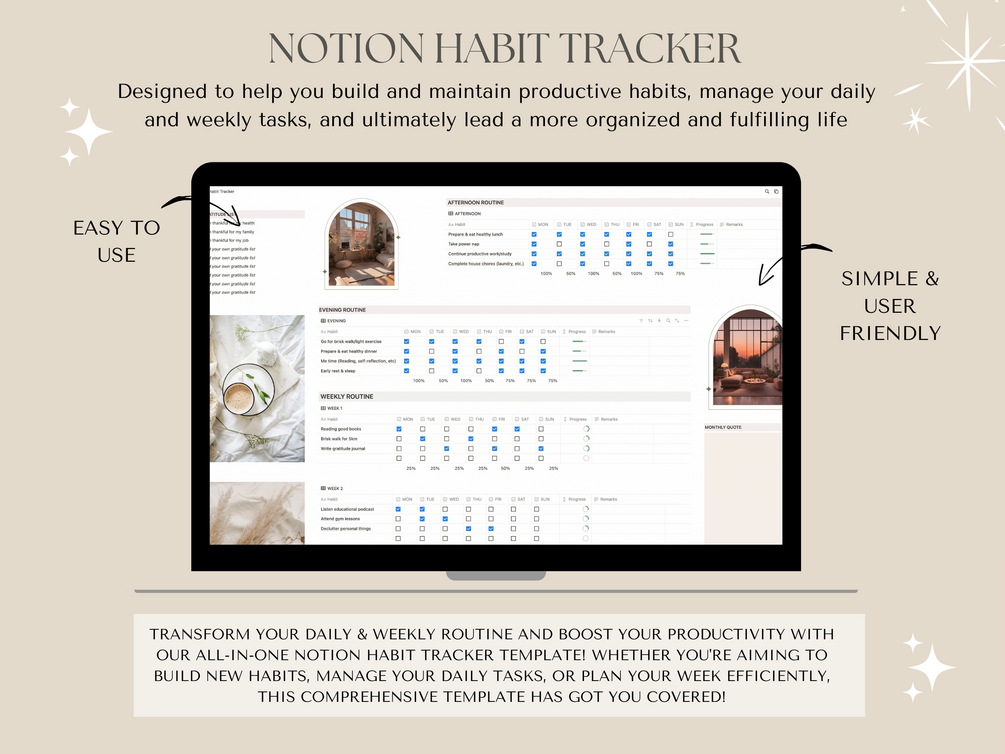 Transform your daily & weekly routine and boost your productivity with our all-in-one Notion Habit Tracker template! Whether you're aiming to build new habits, manage your daily tasks, or plan your week efficiently, this comprehensive template has got you covered.