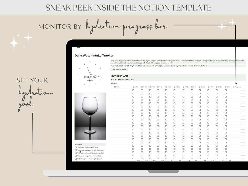 Stay on top of your hydration goals with our Notion Daily Water Intake Tracker! Designed for those who want to keep track of their daily water intake easily and effectively, this digital tracker integrates seamlessly into your Notion workspace, helping you build and maintain healthy hydration habits.