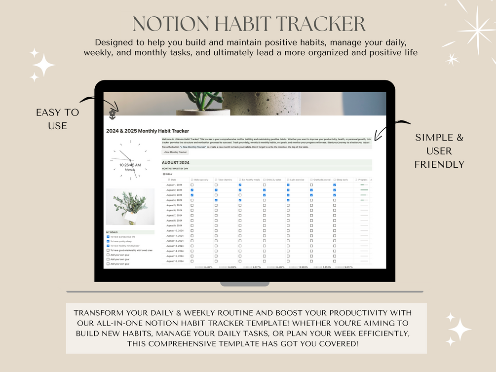 Achieve your goals and cultivate positive habits with our Notion Monthly Habit Tracker template! Perfect for anyone looking to enhance their productivity and maintain an organized lifestyle, this comprehensive template covers daily, weekly, and monthly routines.