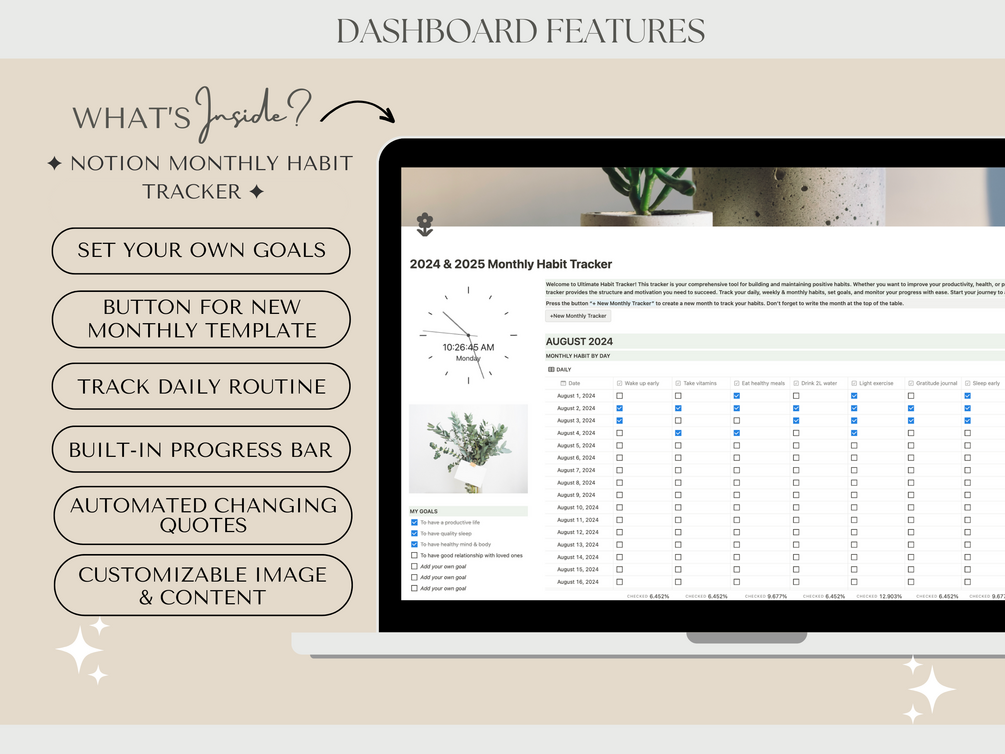 -Monthly Habit Tracking by Day & Week: Stay on top of your habits with detailed tracking options that keep you accountable.